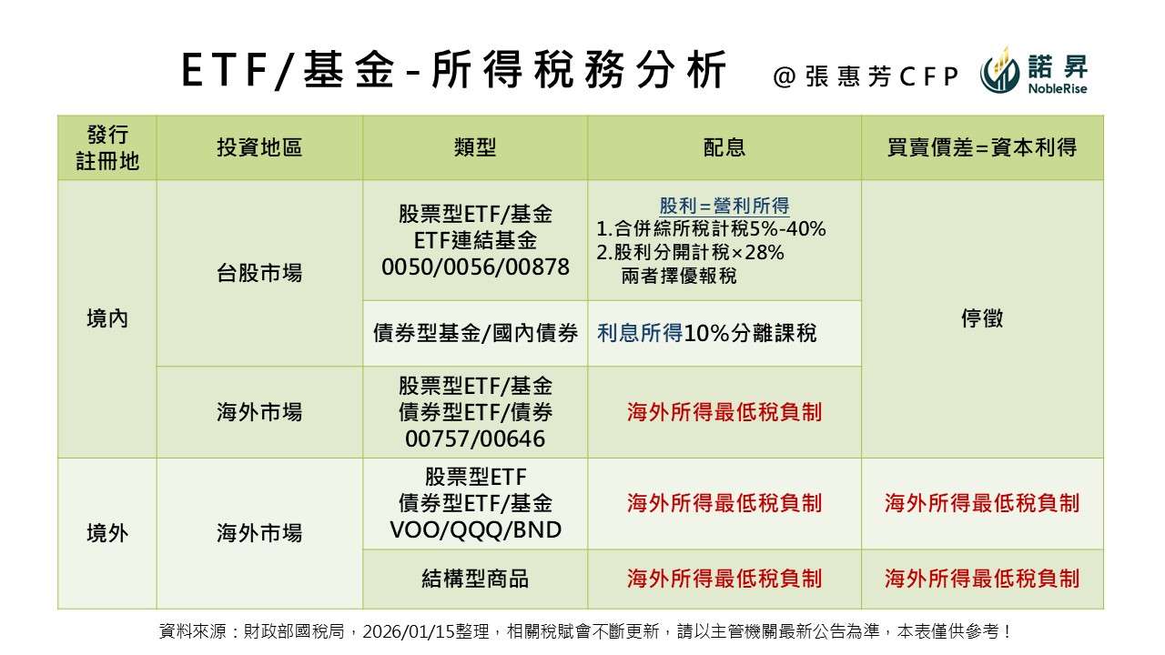 以財務規劃角度,需要在意「稅後淨報酬」,而不是帳面報酬率。 台股上市櫃、多數ETF和公募基金買賣價差停徵證所稅,讓「累積型ETF和不配息的ETF連結基金」 更有機會把報酬留在淨值內持續複利; 但領配息會有股利課稅(合併計稅或 28% 分離課稅),單筆股利和利息給付超過 2 萬元,會被扣 2.11% 補充保費,長期稀釋總報酬。 真正需要資金時,再用有紀律的「提領策略」賣出部分持有單位,把現金流做在自己手上: 想領多少、何時領都能兼顧生活與累積效率。 提領台股ETF會有證交稅與交易成本;若同時有海外所得,記得檢視全年海外所得是否達 100 萬, 且基本所得額等項目合計是否超過 750 萬,避免稅務規劃落差。