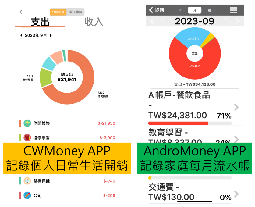 我有用AndroMoney記錄家庭每月流水帳,CWMoney記錄個人日常生活開銷,月底利用APP圓餅圖彙整分類帳,再彙整到每月流動支出。